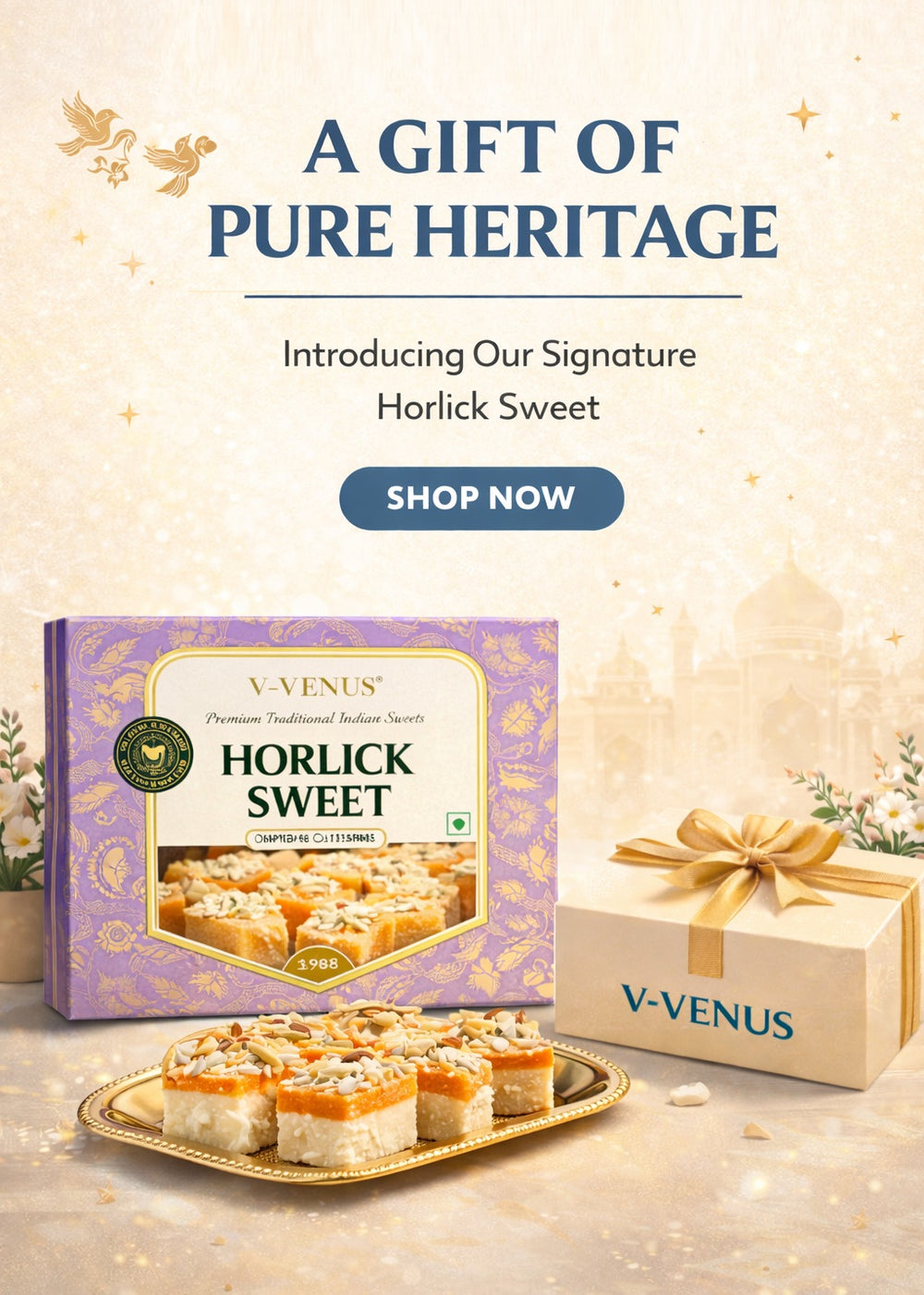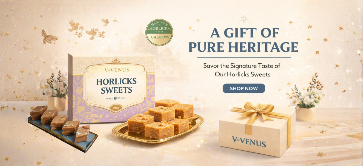 At V-Venus Sweets & Bakers, we craft premium sweets and gifts that celebrate tradition and taste. Every creation is made with love, using the finest ingredients to bring joy to your special moments.